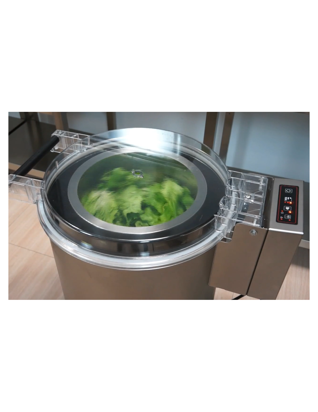 Coperchio sollevabile altamente resistente con ammortizzatore. Questa centrifuga insalata asciuga tutte le verdure in un tempo molto breve, grazie alla sua elevata velocità (900 RPM) e garantendo sempre la qualità del prodotto.