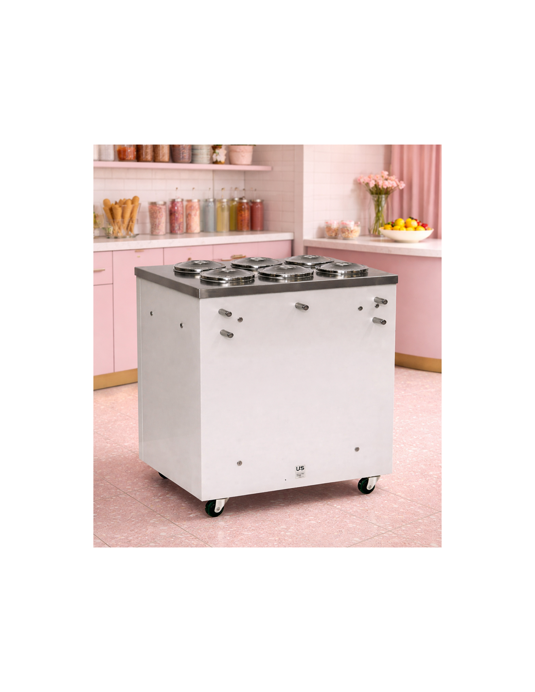 Bancone gelato mantecato per 6 carapine con 4 per la riserva. Bancone gelato con Termostato: Elettronico. Colore esterno: Beige