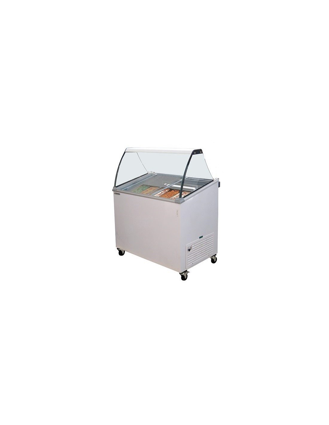 Bancone gelato mantecato Tecfrigo. Banco gelateria per 5 vaschette gelato con copertura in vetro e pannelli scorrevoli.