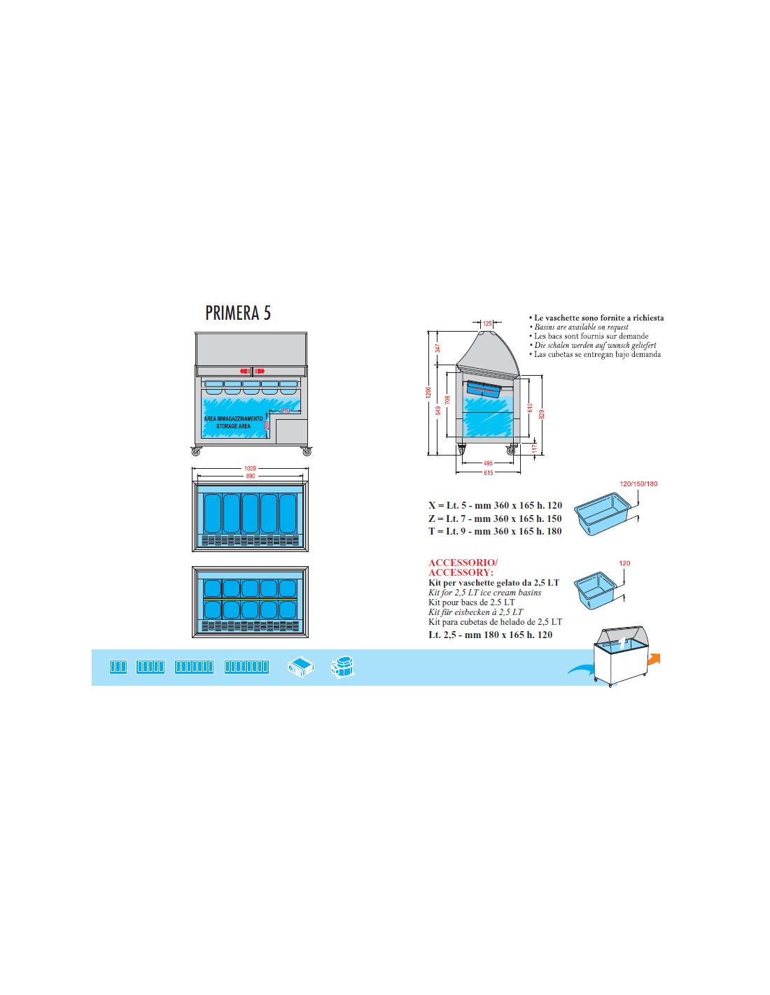 Capacità vaschette ( NON INCLUSE): N° 10 vaschette da 2,5 Lt o N° 5 vaschette da 5, 7 o 9 Lt. Rivestimento interno in alluminio goffrato e copertura con vetri scorrevoli.