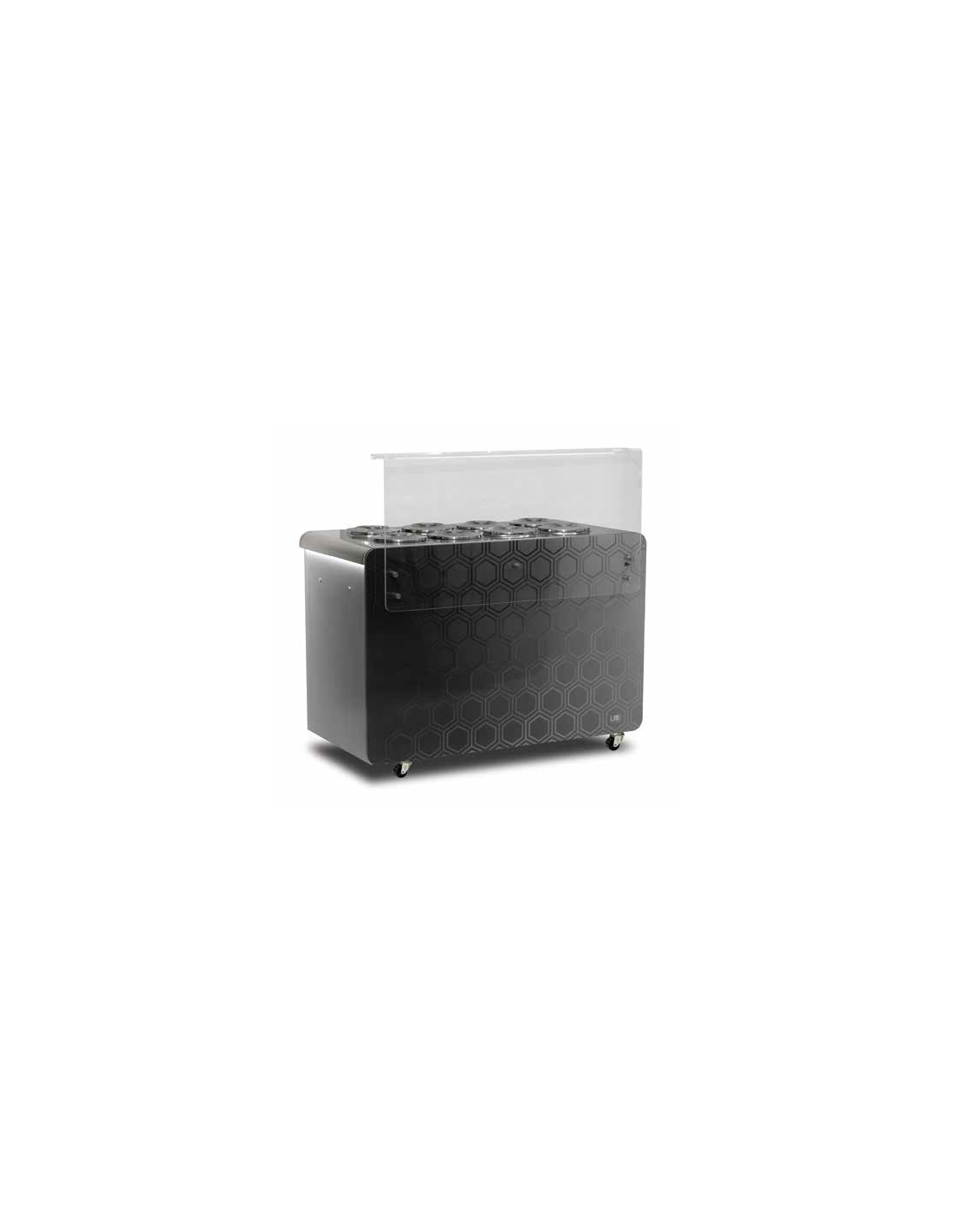 Bancone per gelato mantecato capacità 10 carapine + 8 di riserva ( Non incluse ). Copertura in plexiglass frontale e Pannello frontale con trama a nido d’ape