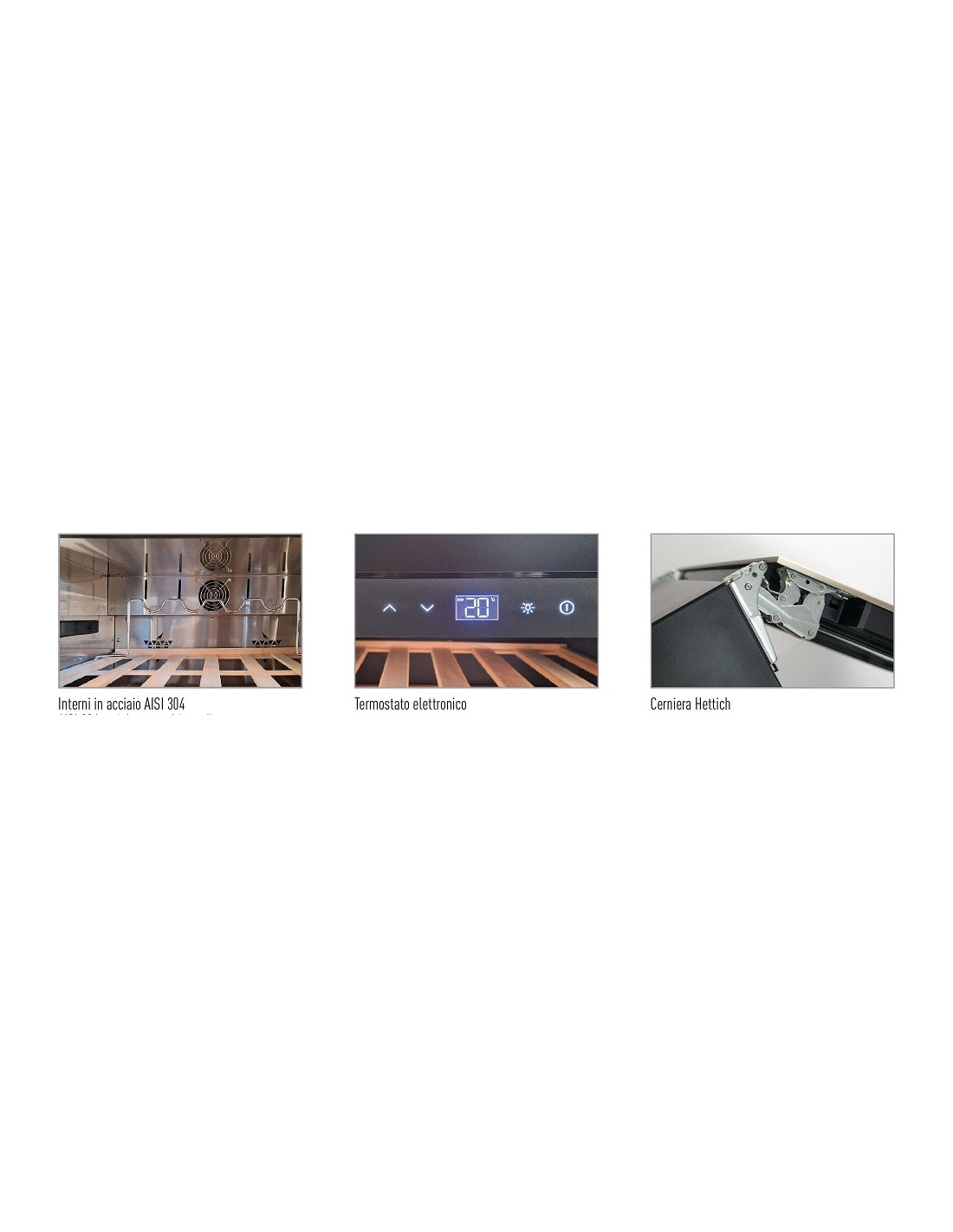 Capacità bottiglie da 75 cl: 72 vano superiore, 69 vano inferiore. Bordolese Alsaziana Borgognotta Rhône Champagnotta
