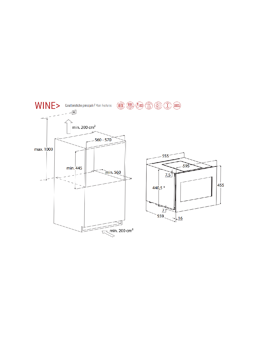 Cantinetta vino da incasso Klimaitalia. Nuova linea domestica di cantinette vino da incasso con leggera finitura satinata capacità 17 Bottiglie cl. 75. Dati indicativi e variabili a seconda dei diversi packaging ( bordolese, alsaziana, borgognotta )