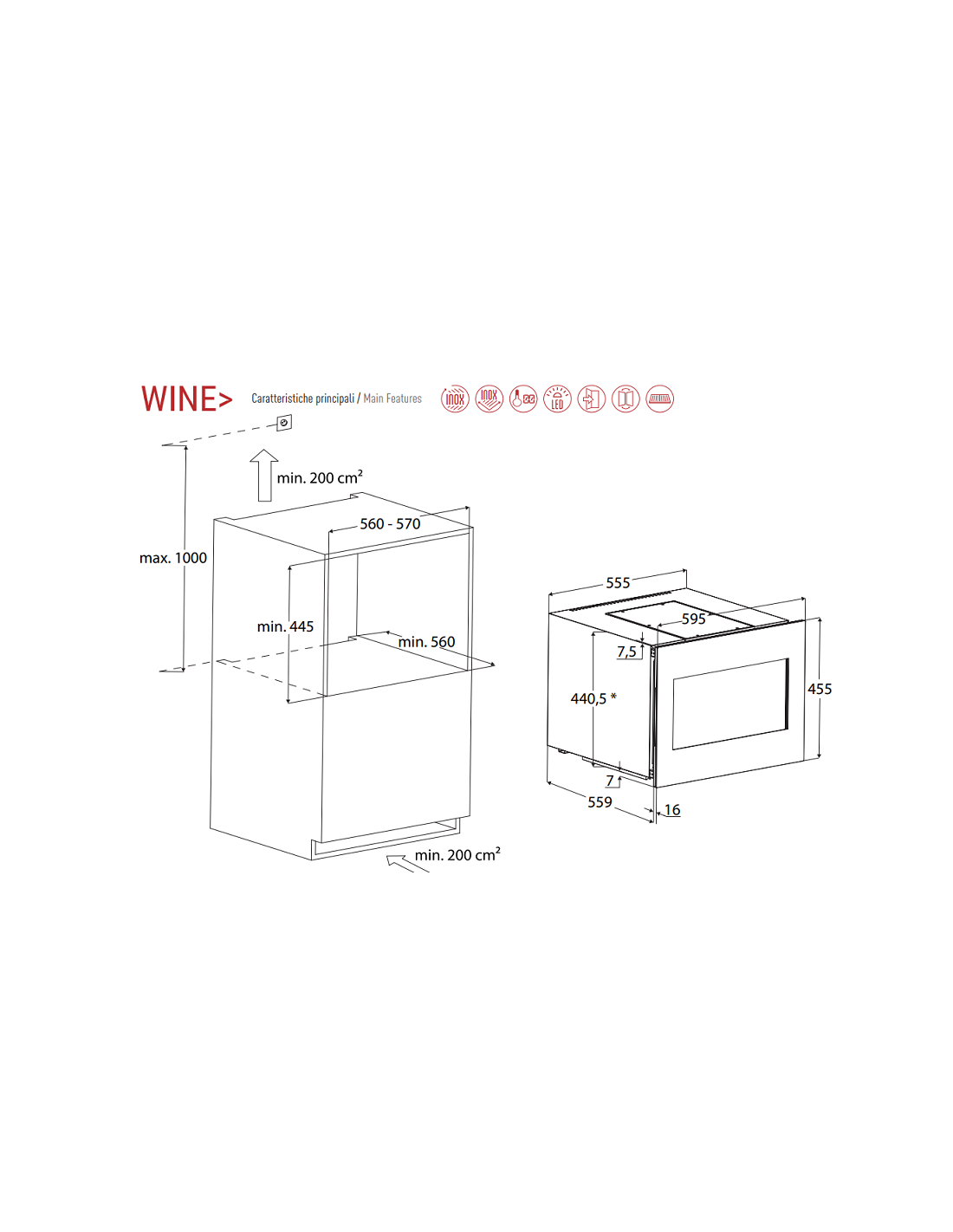 Cantinetta vino da incasso domestica Klimaitalia. Nuova linea domestica di cantinette vino da incasso nera per 17 Bottiglie cl. 75. Dati indicativi e variabili a seconda dei diversi packaging ( bordolese, alsaziana, borgognotta )