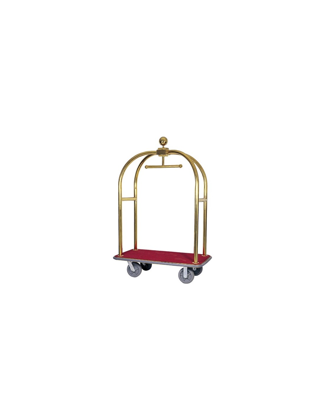 Carrello servizio Hotel portavaligie Forcar con porta abiti in acciaio ottonato. Carrello portabagagli e abiti con pianale in legno ricoperto di moquette rossa