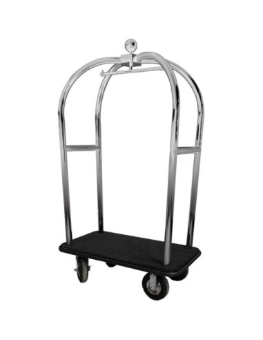 Carrello portavaligie e portabiti di Forcar per hotel adatto al trasporto di bagagli in Acciaio Inox per servizio hotel con ruote pneumatiche. Portavaligie con pianale in legno ricoperto di moquette nera.