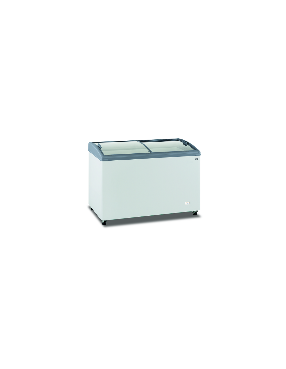 Congelatore a pozzetto. Congelatore a pozzetto con vetri curvi scorrevoli, colore esterno: bianco e grigio, capacità 180 litri.