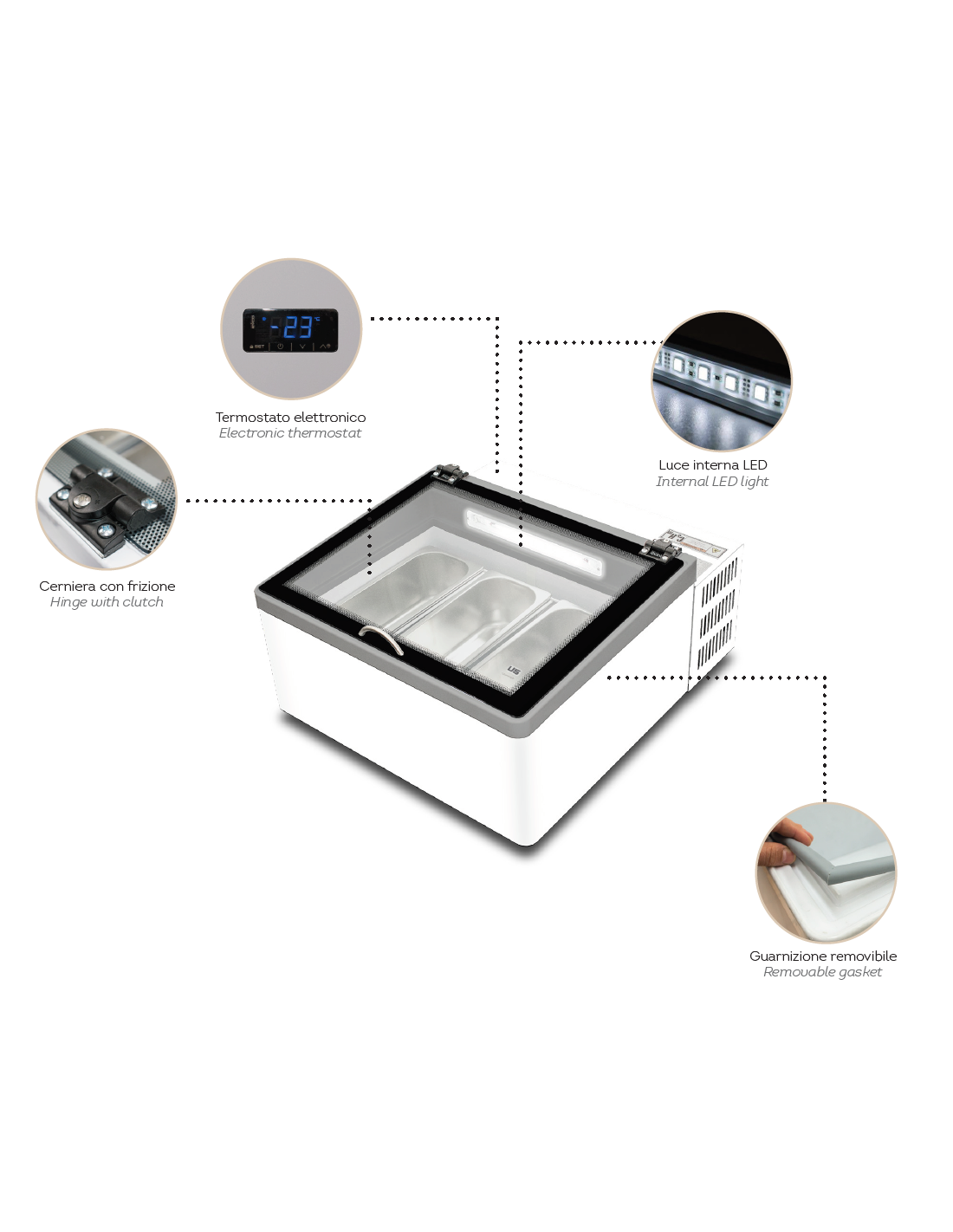 Congelatore da banco per vaschetta gelato mantecato. Piccolo congelatore da banco gelato con capacità vaschette 6 da 2,5 Lt o 3 da 5 Lt (non incluse)