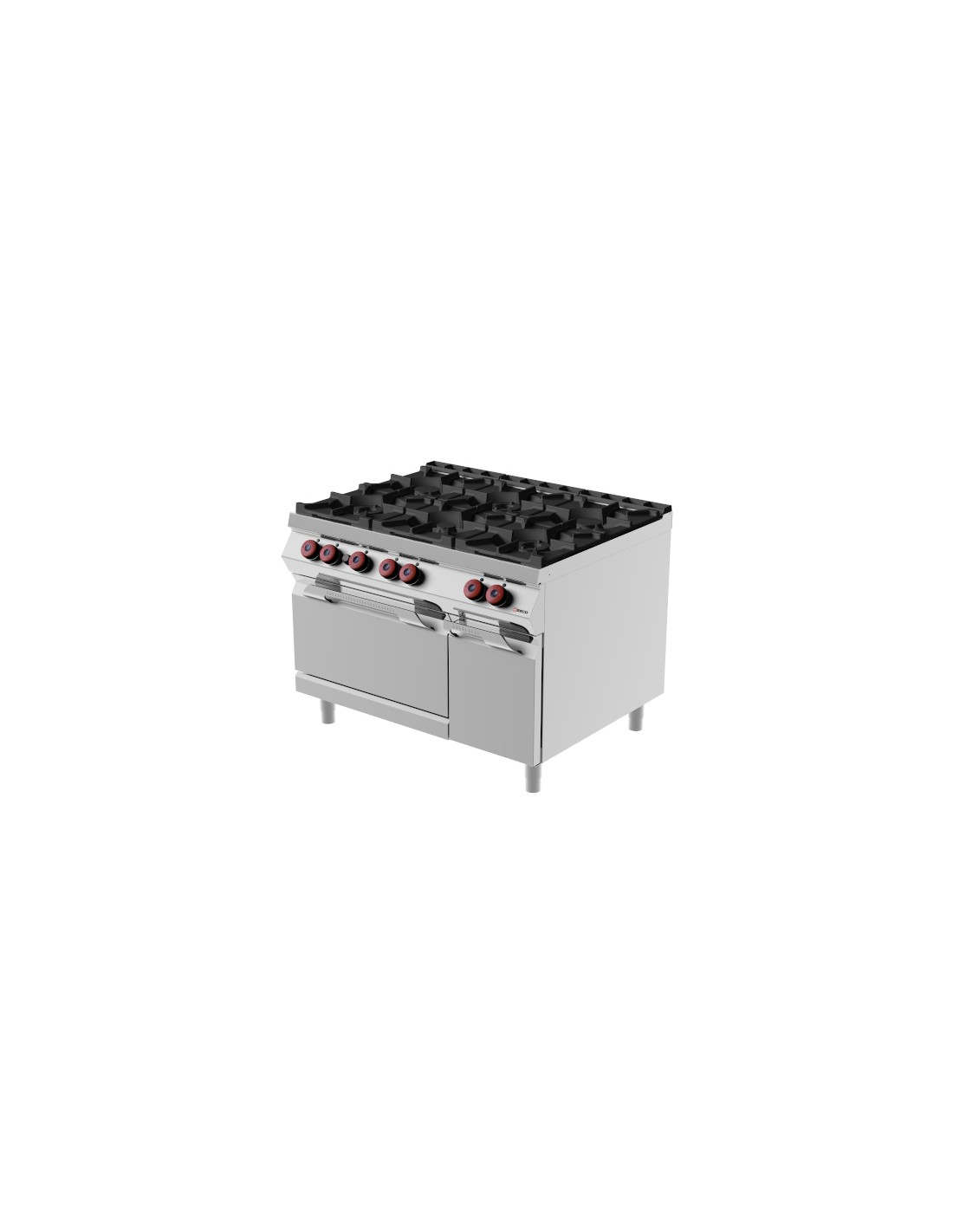 Cucina a gas con 6 fuochi aperti Desco. Cucina 6 fuochi con forno a gas GN 2/1 Dimensione mm 1200x900x900 e armadietto neutro. Dimensione forno 650x560x300 mm.