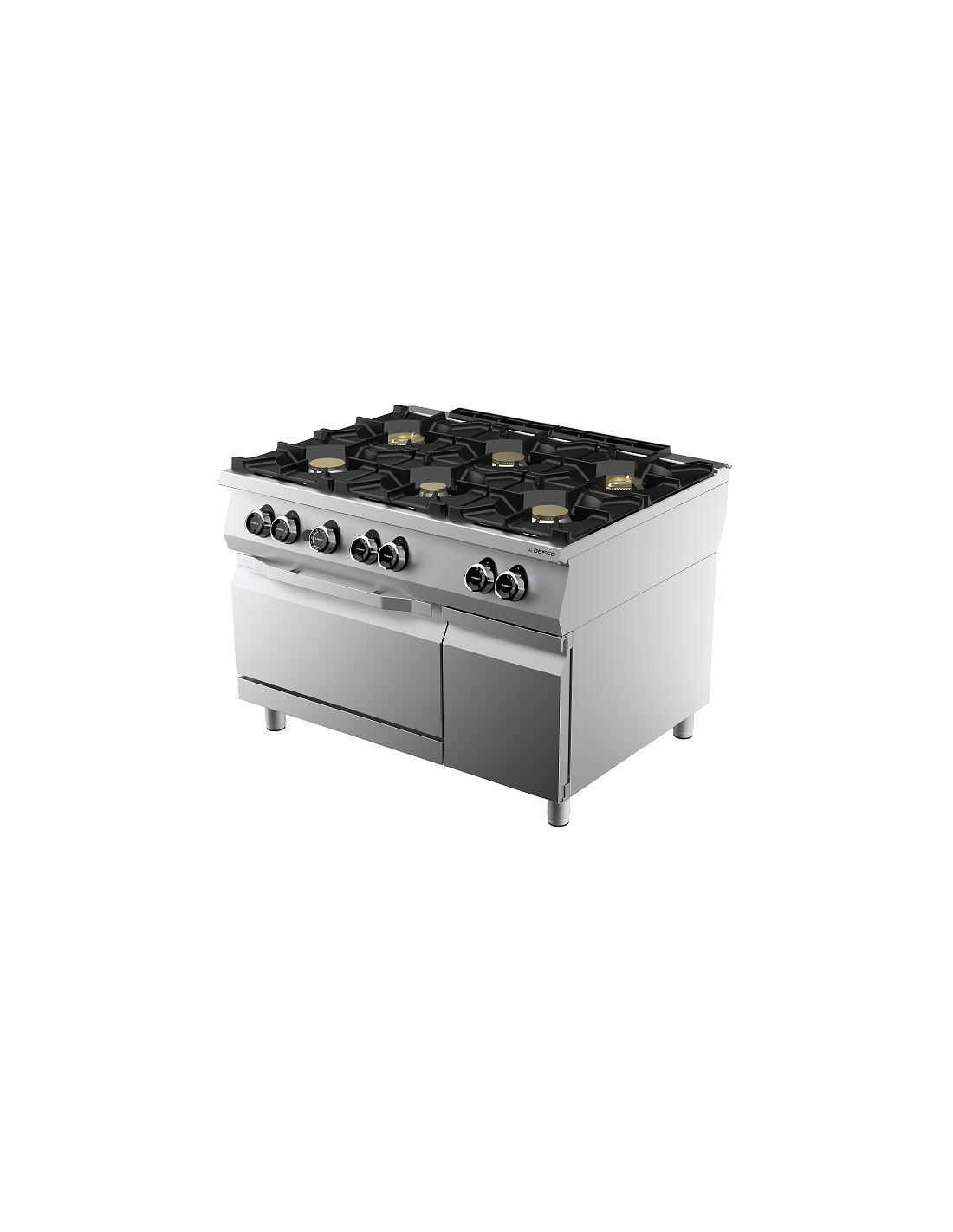Cucina a gas con 6 fuochi aperti Desco. Cucina a gas con 6 fuochi con forno Dimensione mm 1200x905x900 e forno a gas GN 2/1 statico e armadietto neutro