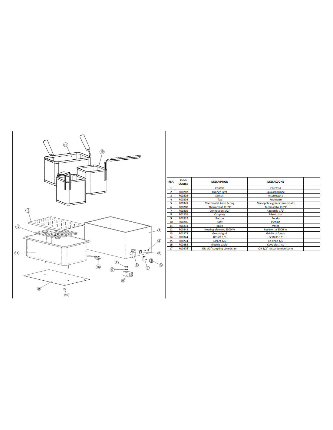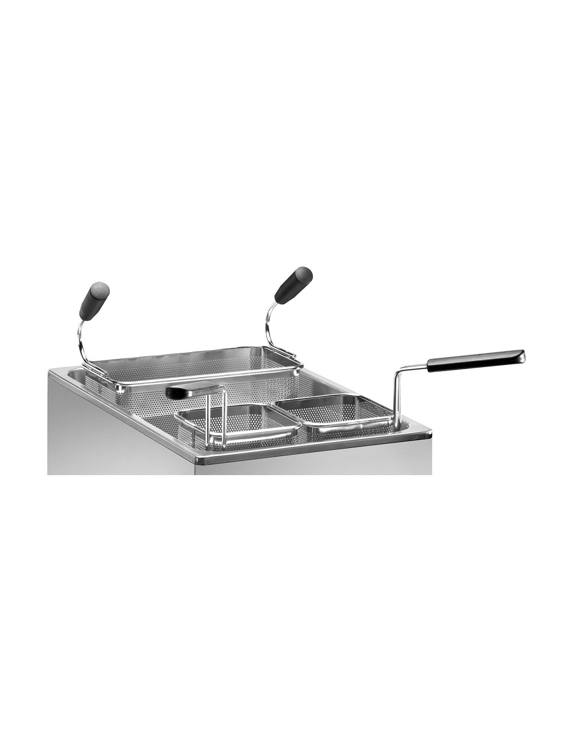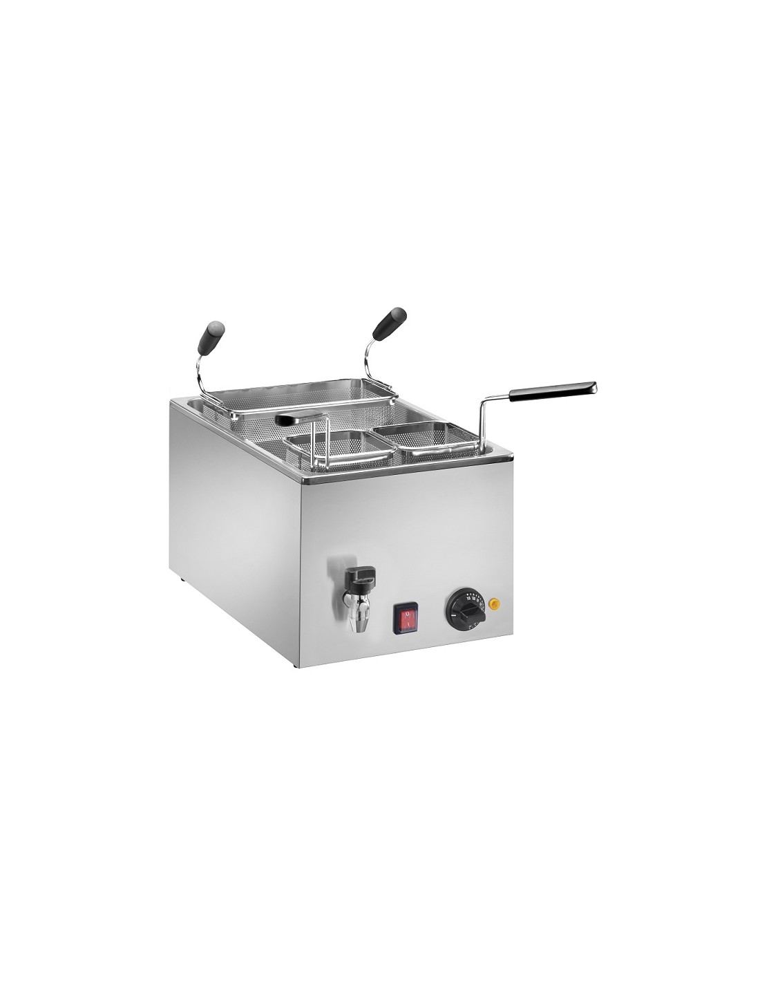 La vasca, i cestelli e la griglia di fondo sono realizzati in acciaio inox AISI 316, materiale altamente resistente alla corrosione e perfetto per l’uso intensivo. Il termostato regolabile da 0 a 110°C consente il pieno controllo della temperatura, mentre il rubinetto di scarico facilita il ricambio dell’acqua e la pulizia.
