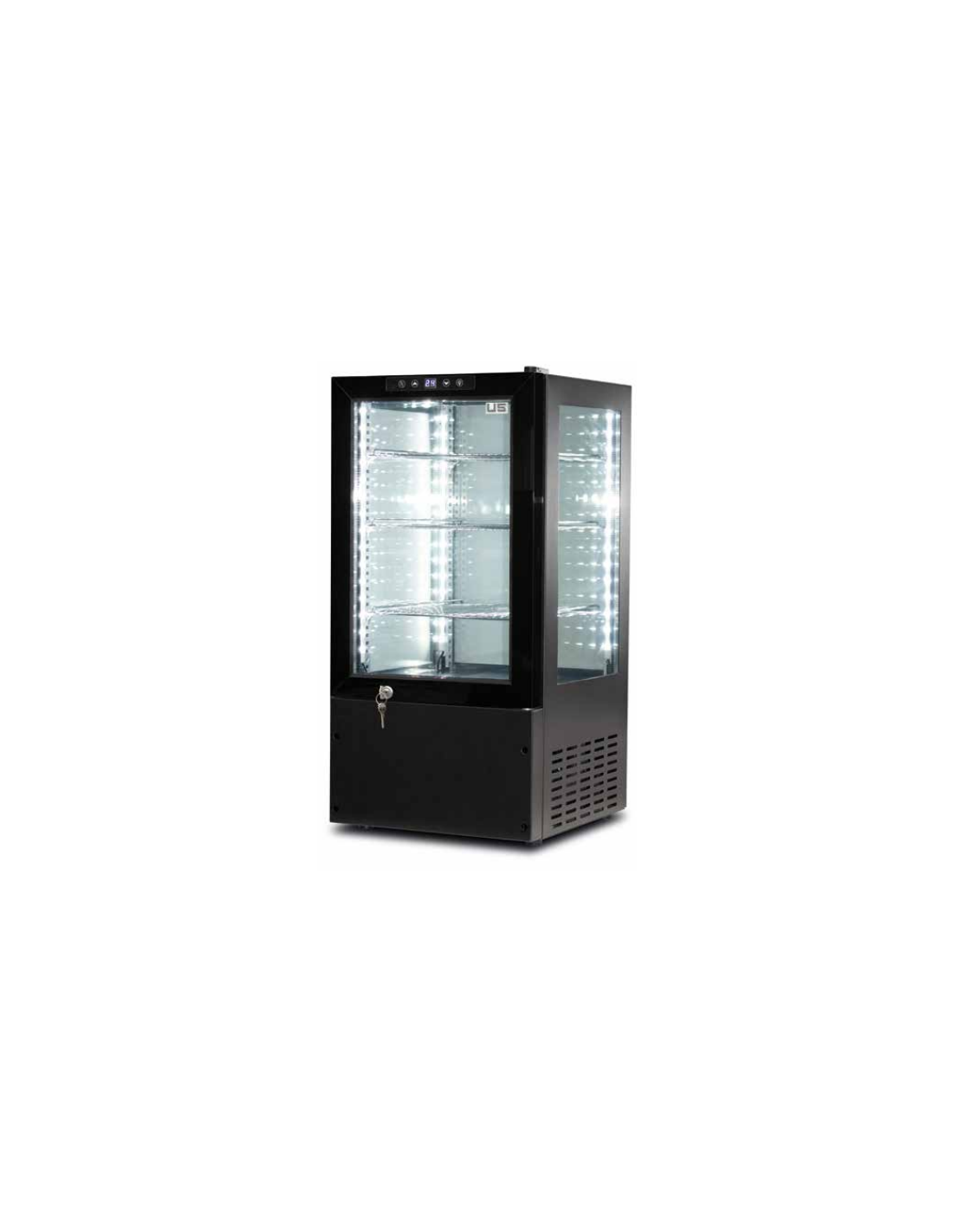 Frigorifero bevande sopra banco con quattro lati vetro e 4 Luce LED con interruttore. Frigorifero per bevande da banco con tecnologia touch screen integrata sul vetro e finiture in acciaio.