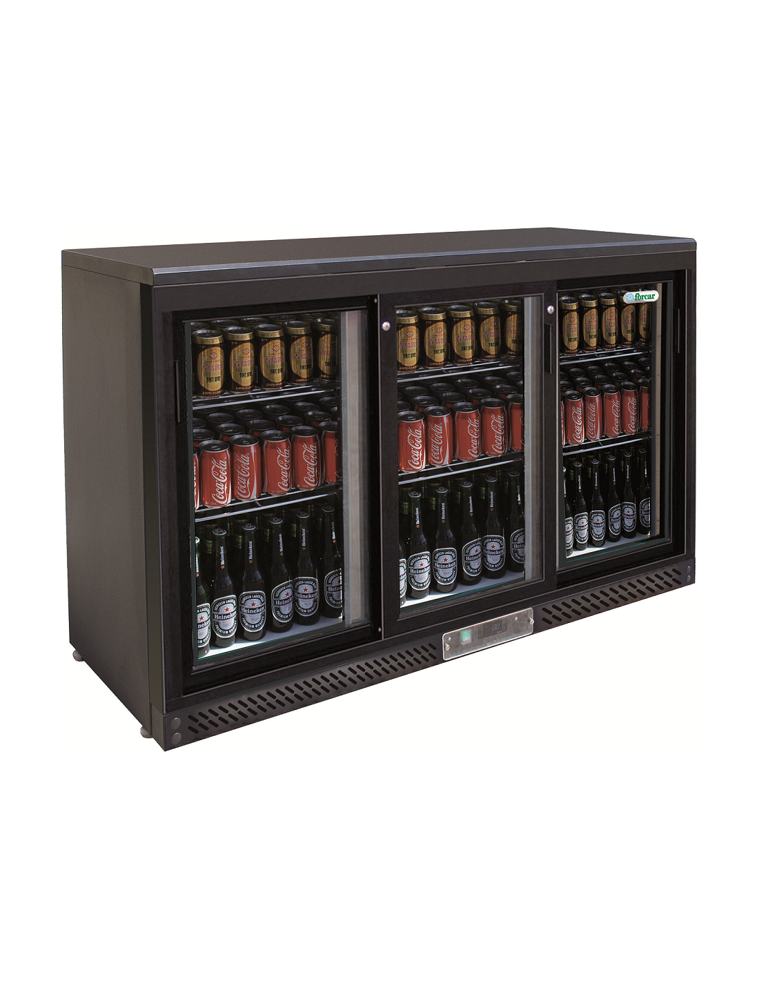 Frigorifero bevande orizzontale retrobanco. Frigorifero per bevande nero con 3 porte scorrevoli per bottiglie 33 cl e lattine