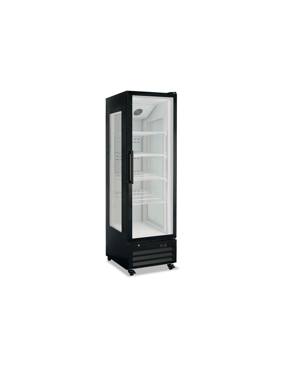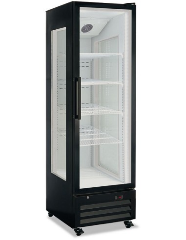 Frigo vetrina per bevande Klmaitalia con due lati vetro, colore nero. Frigo vetrina per bottiglie e lattine con 4 mensole 450x476