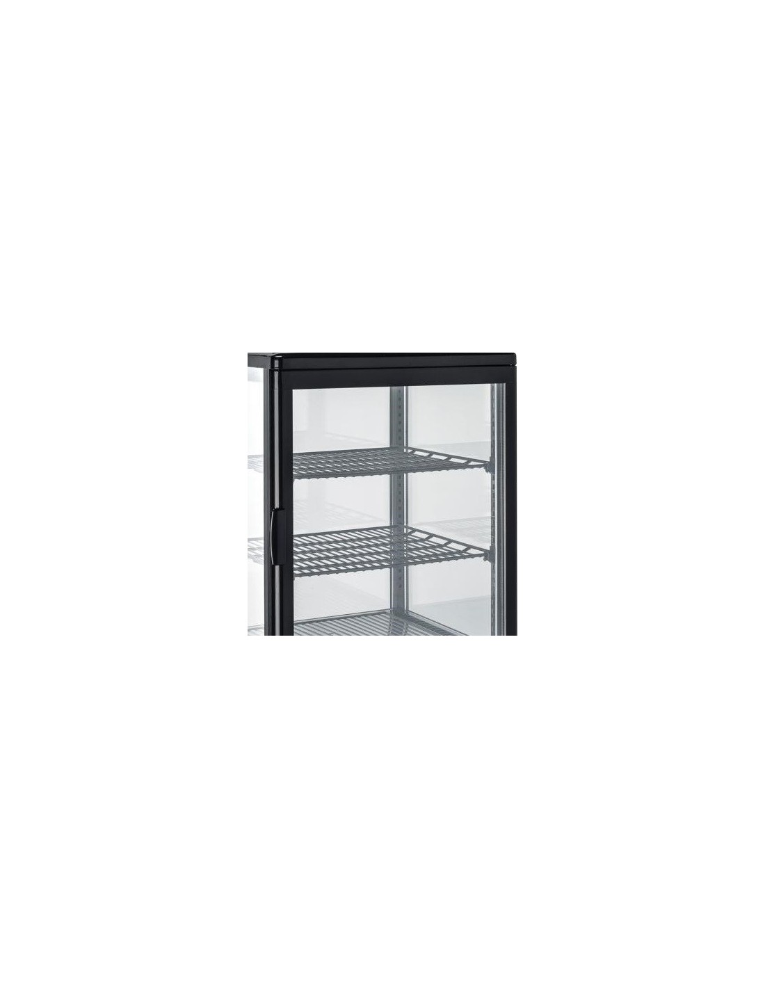 Frigo vetrina verticale Cool Head. Vetrina frigo nera con 4 Lati Espositivi, 2 ripiani, sbrinamento a fermata compressore dotata di Vetro diritto con cornice nera e basamento in plastica