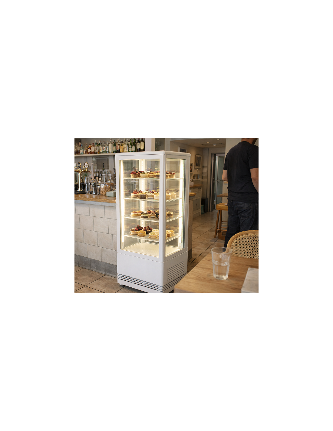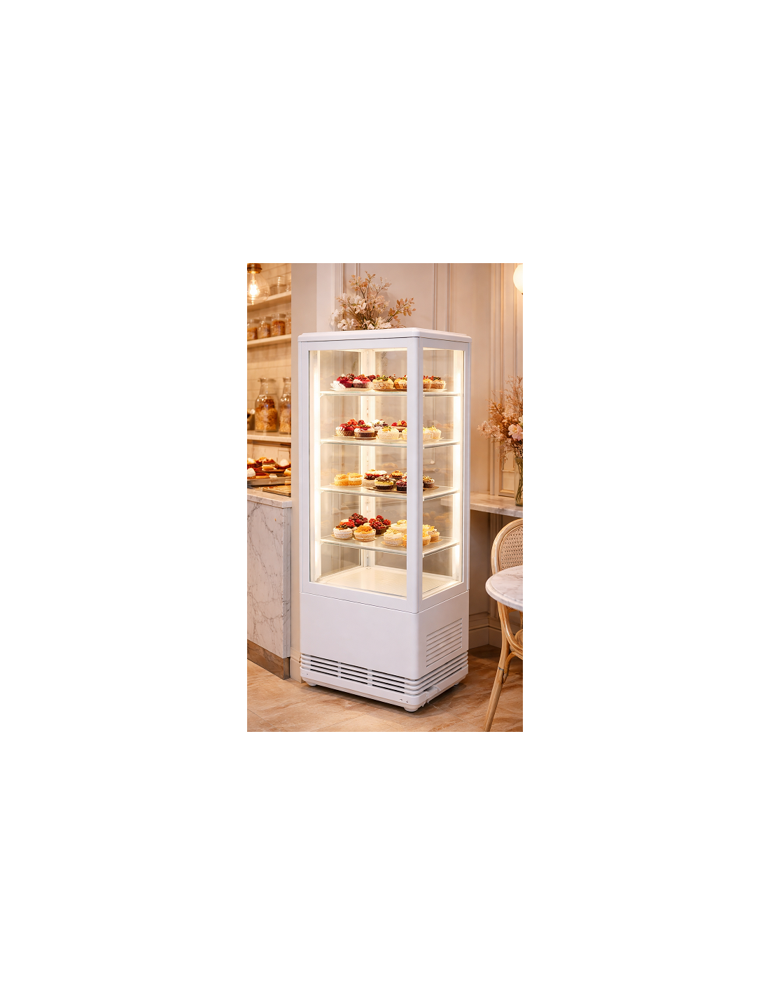 Vetrina frigo con 3 ripiani regolabili e quattro lati vetro, per dolci, frutta e alimenti salati.. Refrigerazione Ventilata