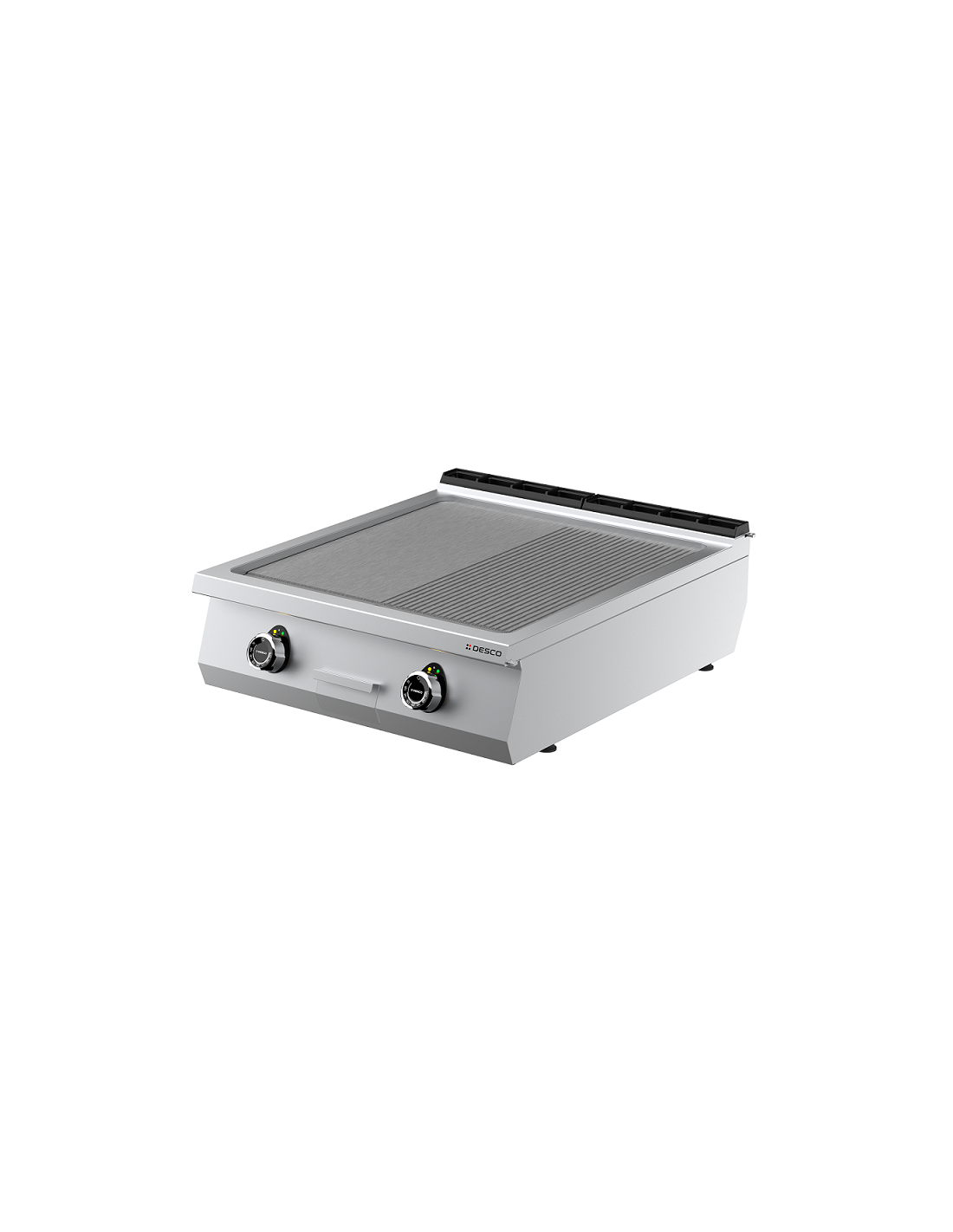 Frytop elettrico da banco Desco. Frytop elettrico da banco serie top con piastra liscia e rigata cromata. Realizzata in acciaio inox Scotch Brite. Le piastre di cottura sono realizzate in speciale lega ferritica di grosso spessore ad alta conducibilità termica anche in versione cromata e sono disponibili liscie, rigate o liscie/rigate.