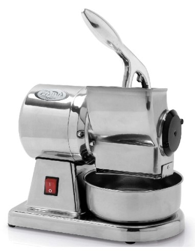Grattugia elettrica di Fama Industrie in alluminio pressofuso lucido. Grattugia elettrica, produzione oraria 30 Kg con rullo grattugia punzonato standard con trattamento certificato. Robusto motore asincrono ventilato e Vasca in Acciaio Inox