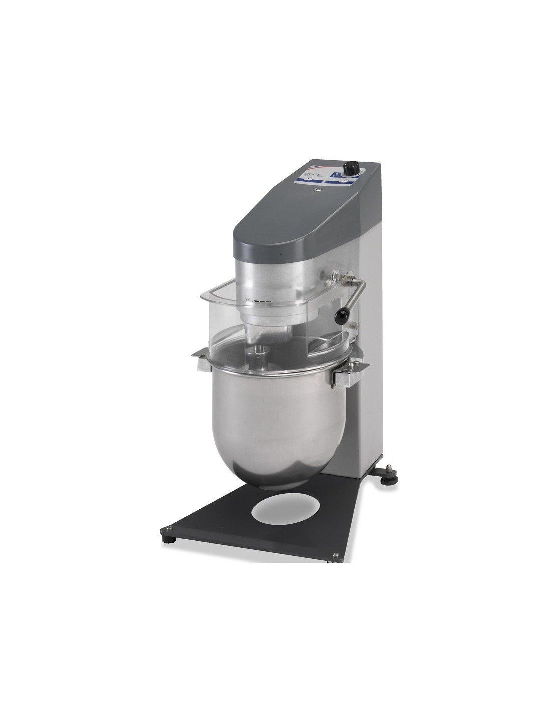 Impastatrice planetaria provvista di protezione di sicurezza estraibile e Sollevamento-abbassamento del paiolo mediante leva. Doppio microinterruttore di sicurezza, per la posizione del paiolo e della protezione. Idonea ad un uso intensivo rispetto al modello BM-5E