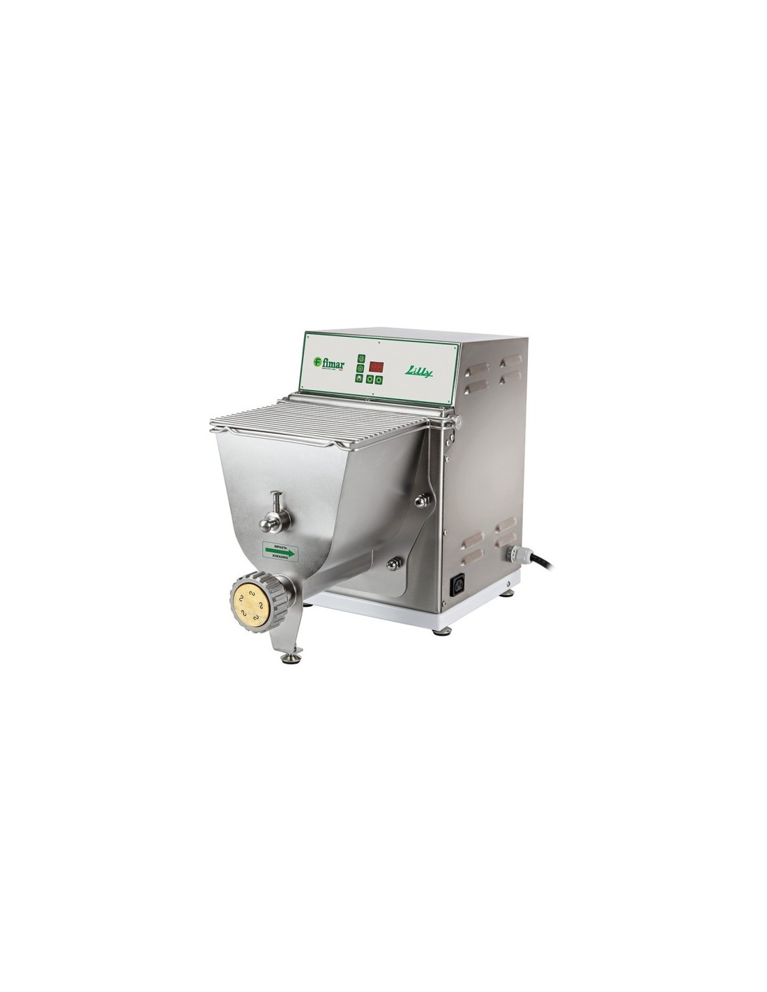 Macchina per la pasta fresca linea Lilly di Fimar. Macchina per la pasta elettrica Produzione Oraria 8 Kg e lavorata con le trafile in bronzo. Macchina per fare la pasta fresca ideale per impastare ed estrudere impasti in diversi formati.