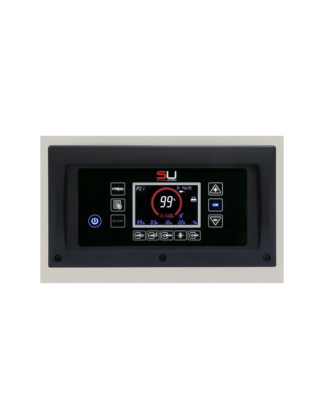 Schermo LCD da 3.9” a colori contenente tutte le informazioni in un’unica schermata e con una tastiera touch retroilluminata. Capacità della pompa (60 Hz): 16 m³/h. Macchina per sottovuoto a campana con memoria da 25 programmi con opzione di blocco