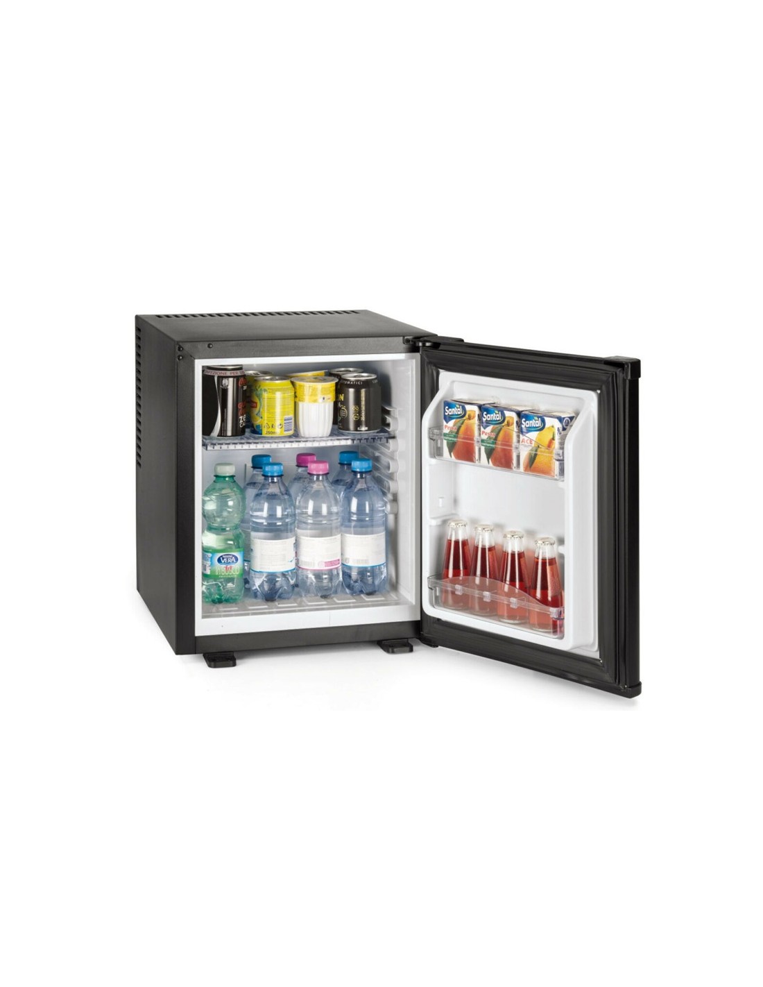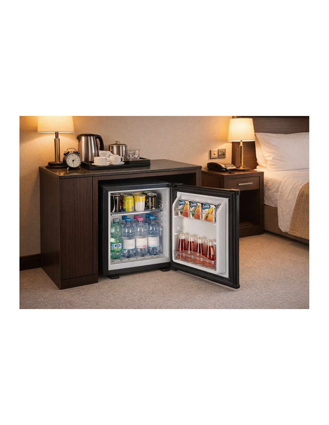 Dotato di pompa di calore ad alta efficienza, questo minibar assicura bassi consumi energetici (0,247 kW/giorno) e assenza totale di rumore (0 dB), per un comfort assoluto in camera. La temperatura interna varia tra 0 e +10°C con temperatura ambiente fino a 30°C. Lo sbrinamento è automatico, mentre l’illuminazione interna a LED permette di individuare facilmente ogni contenuto.