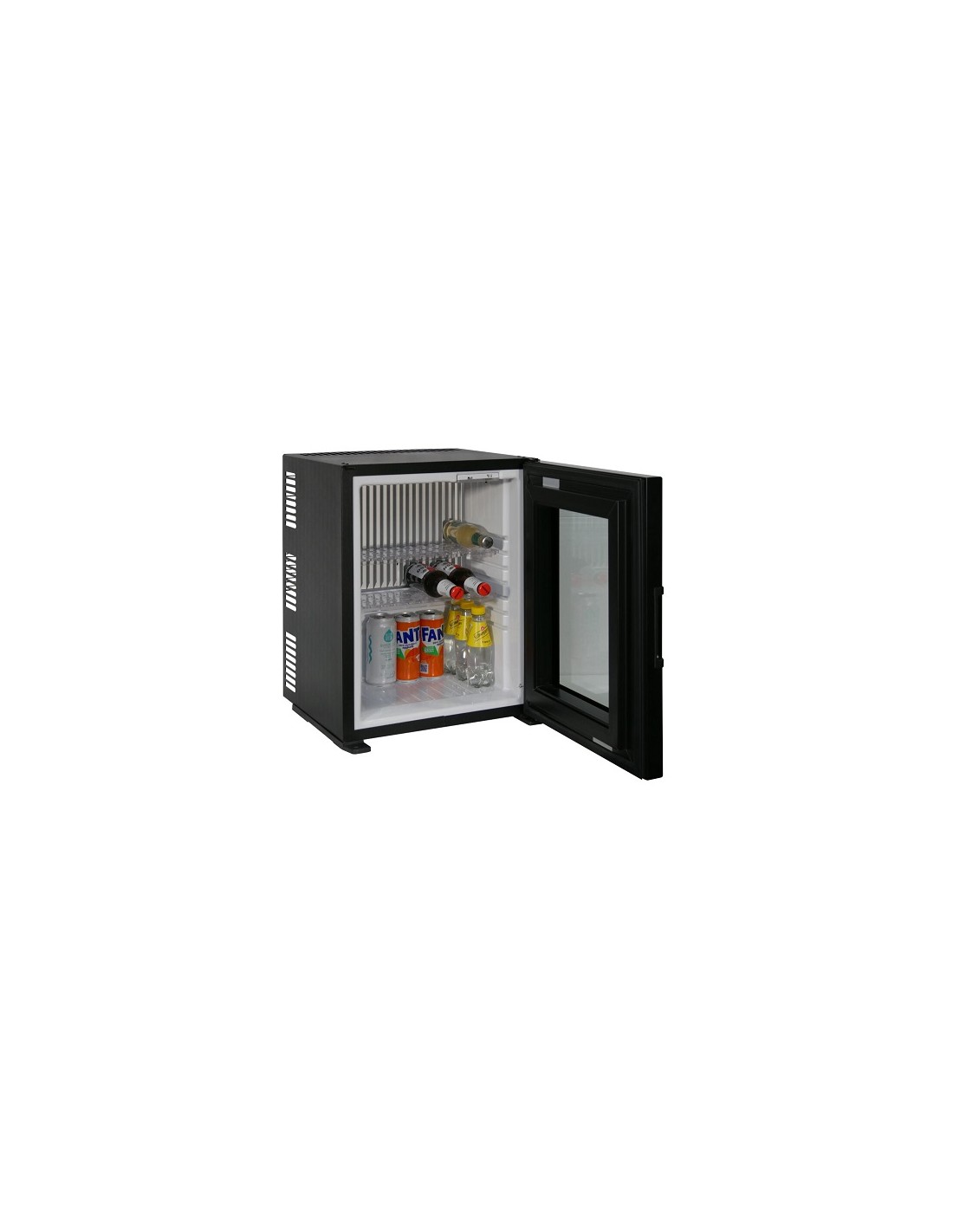 Minibar per Hotel con tecnologia termoelettrica Peltier. Minibar nero da 40 Litri con porta a vetro reversibile di colore nero con modalità sleep completamente silenziosa a 0 dB per non disturbare il riposo notturno degli ospiti.