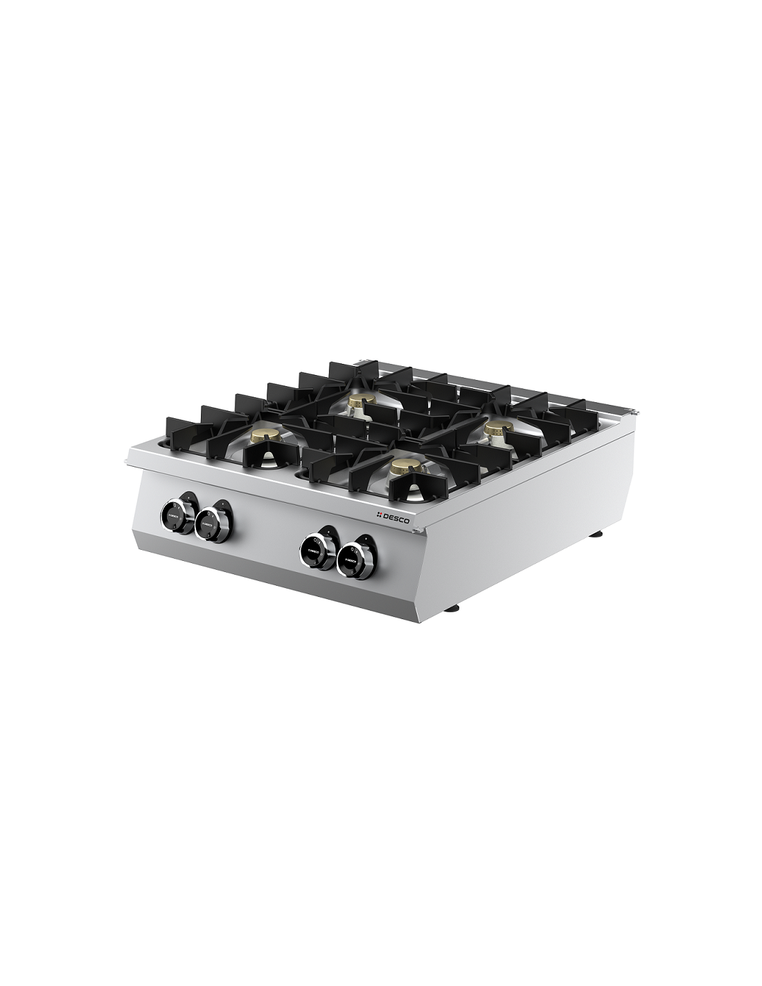 Cucina a gas da banco con 4 fuochi ermetici e fiamma pilota. Riscaldamento tramite bruciatori in ottone a doppia corona con potenza regolabile da 6 kW e 10 kW.