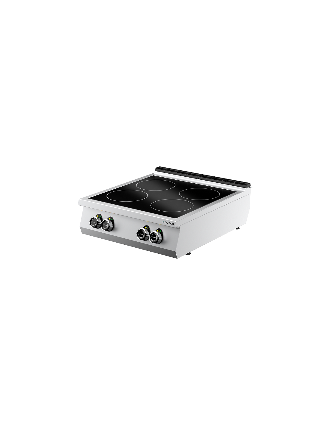 Piano cottura elettrico da banco Desco. Piano cottura elettrico con 4 fuochi in vetroceramica. Grazie alle resistenze poste sotto al piano, raggiungono velocemente i 500°C