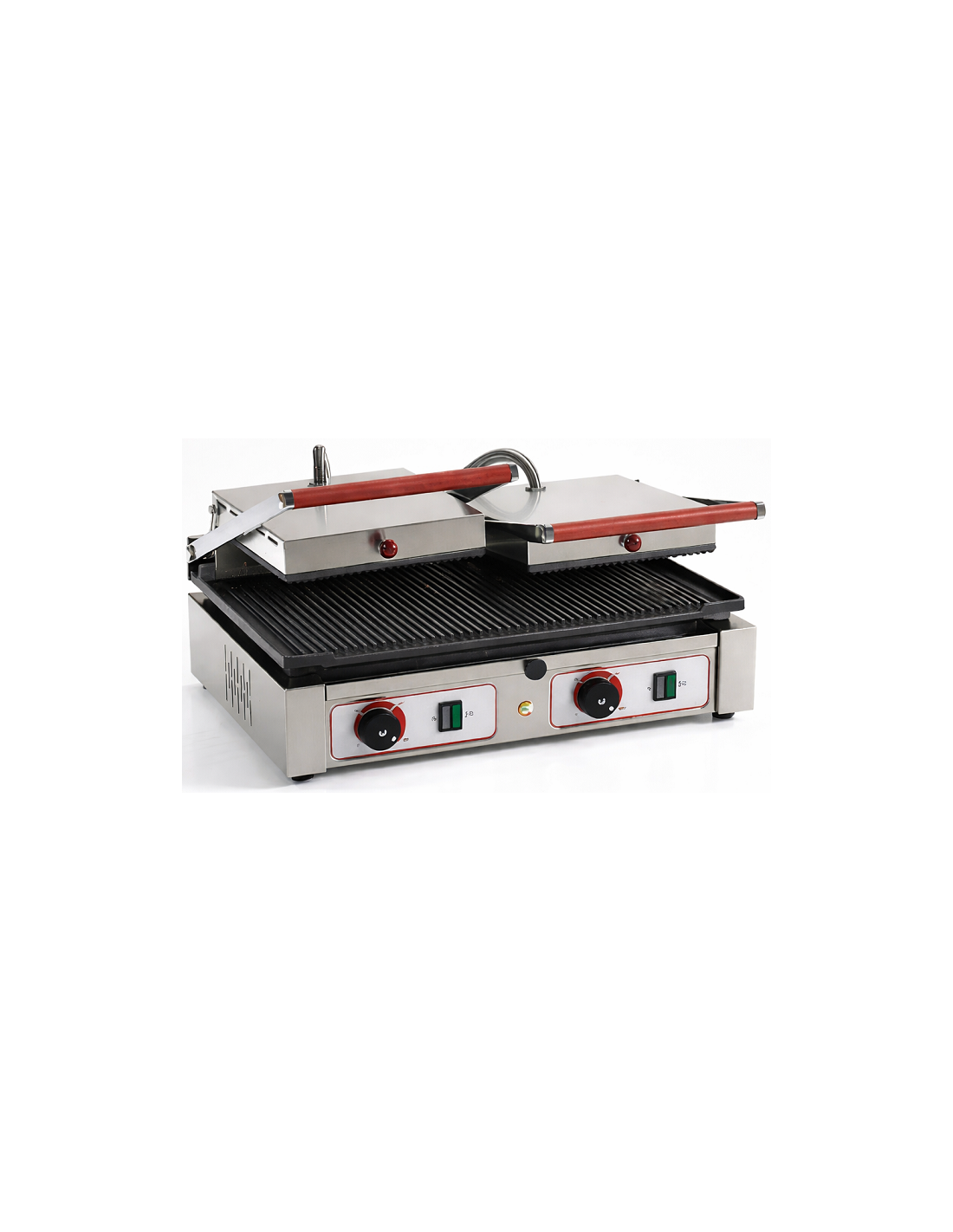 Piastra elettrica in ghisa doppia professionale con base rigata e coperchi rigati per cuocere e riscaldare vari alimenti. Superficie utile di cottura: 505x260 mm cuocere e riscaldare