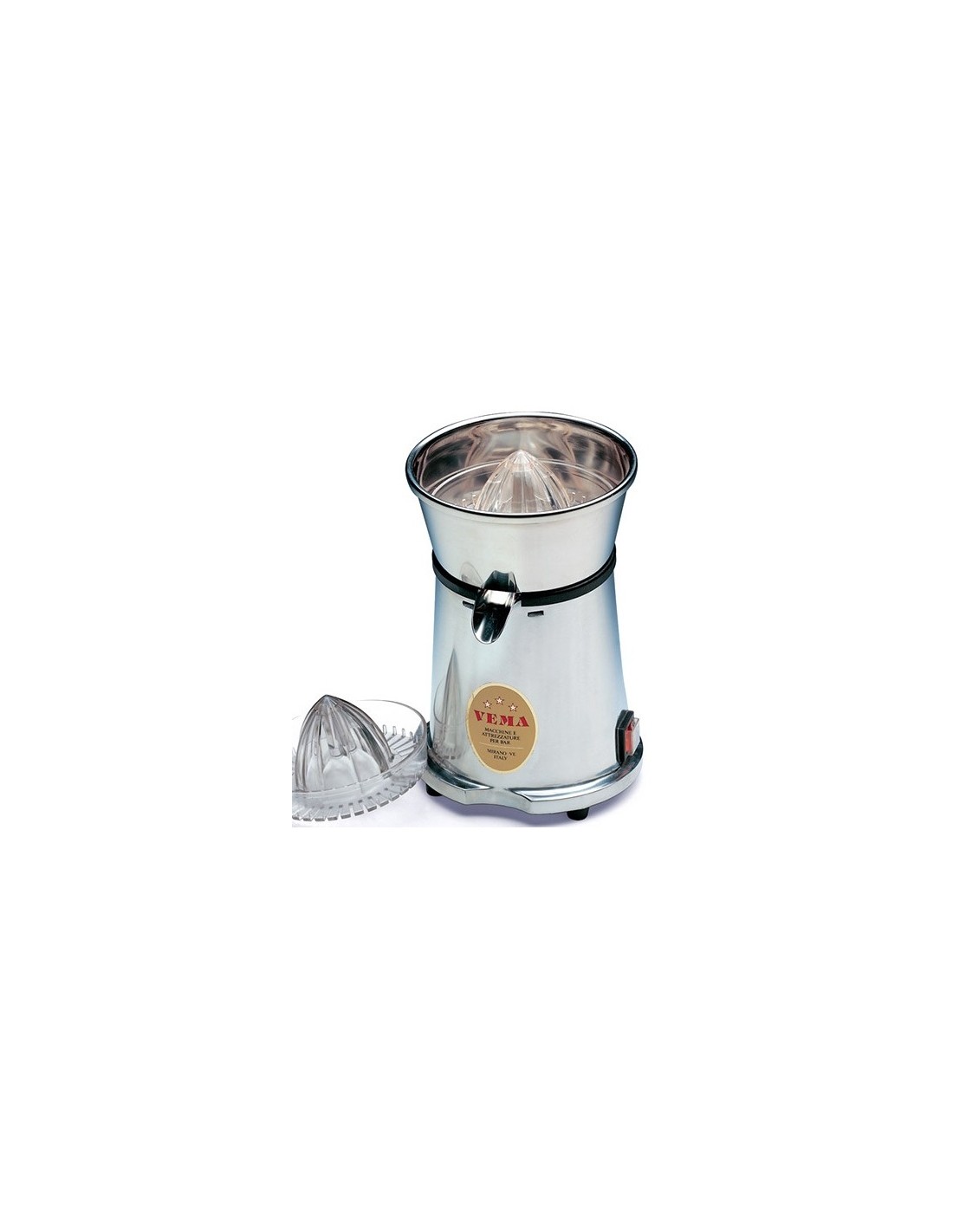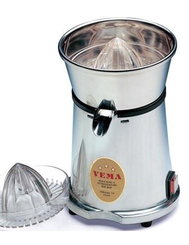 Spremiagrumi elettrico Vema per bar, caffetterie, chioschi per spremere limoni, arance e pompelmi. Spremiagrumi elettrico professionale a pressione con una speciale forma della pigna in policarbonato studiata per sfruttare solo la polpa senza intaccare la buccia.