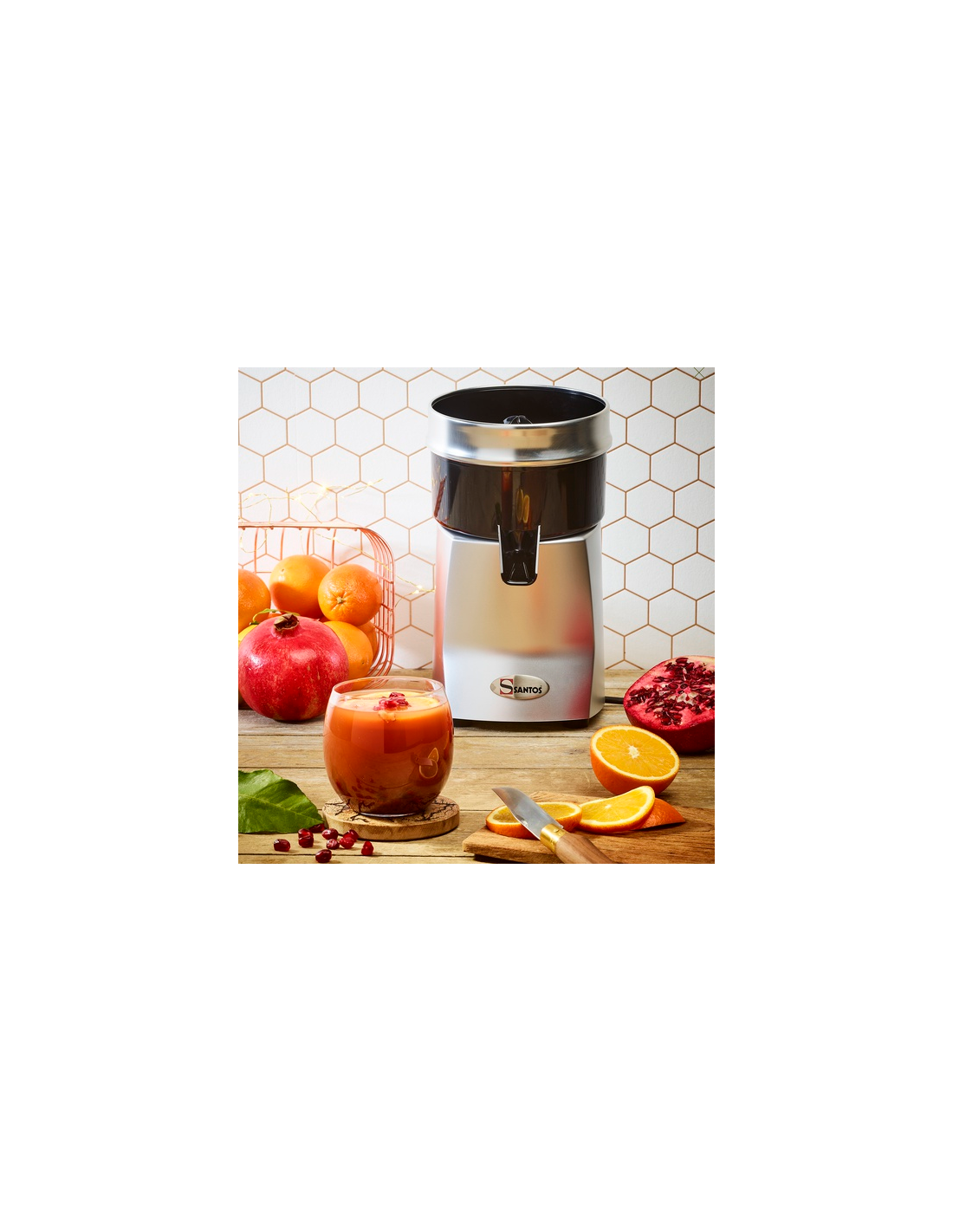 Spremiagrumi elettrico professionale di Santos con finitura Cromata 40W. Spremiagrumi elettrico con la speciale forma della pigna è studiata per sfruttare solo la polpa senza intaccare la buccia.
