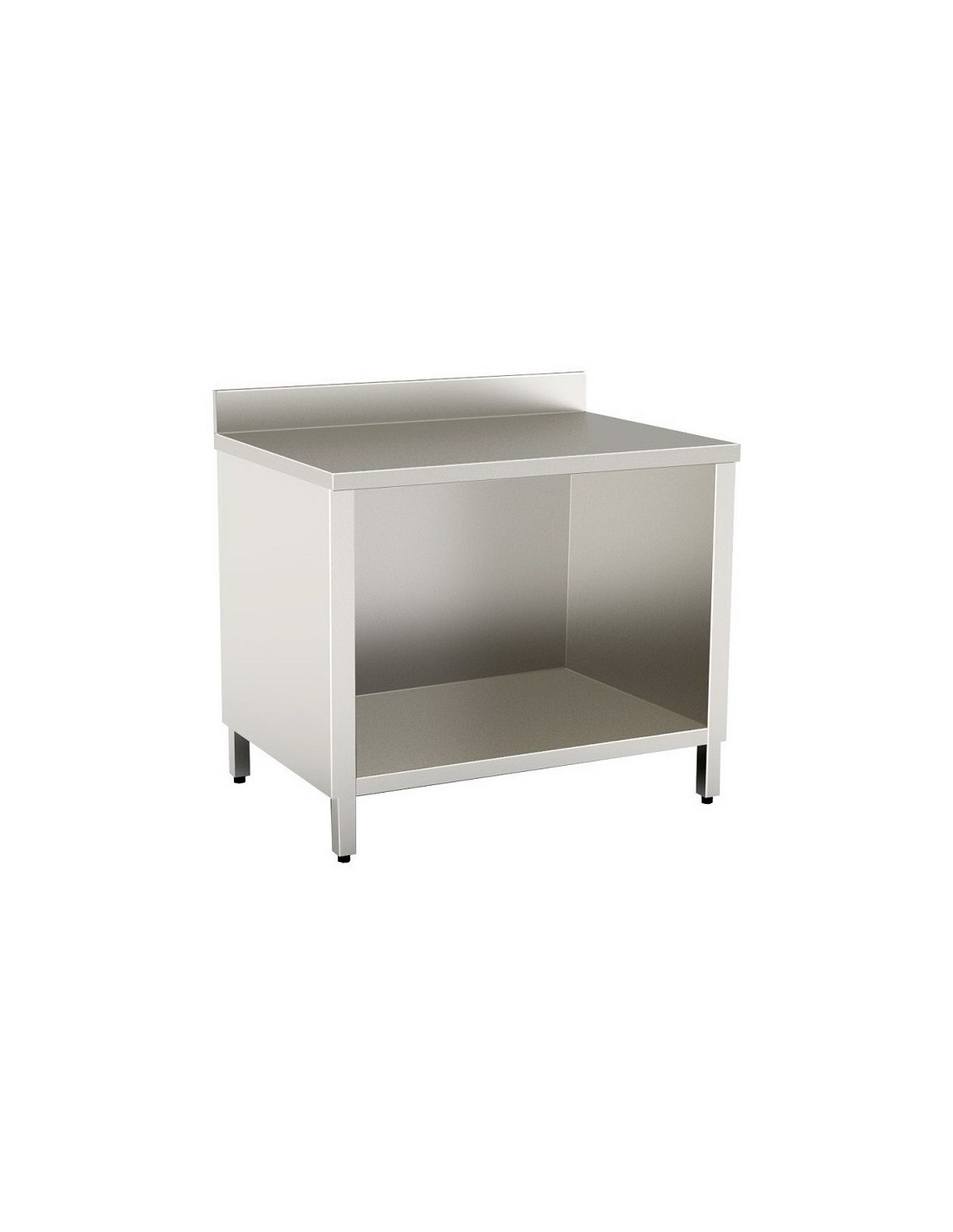 Tavolo armadiato inox a giorno con alzatina con struttura in acciaio inox AISI 304 18/10 scotch brite anticorrosione e antitaglio;