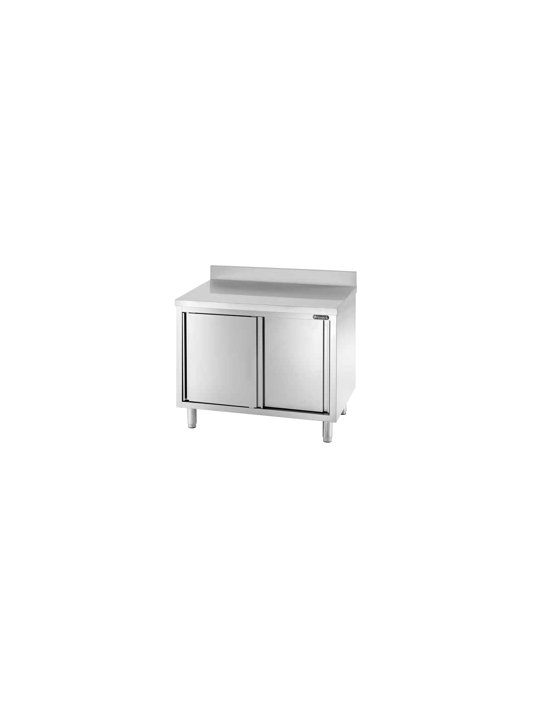 Tavolo Armadiato inox con Ante Scorrevoli con Alzatina. Struttura in acciaio inox. Top in acciaio inox AISI304 (conforme MOCA)