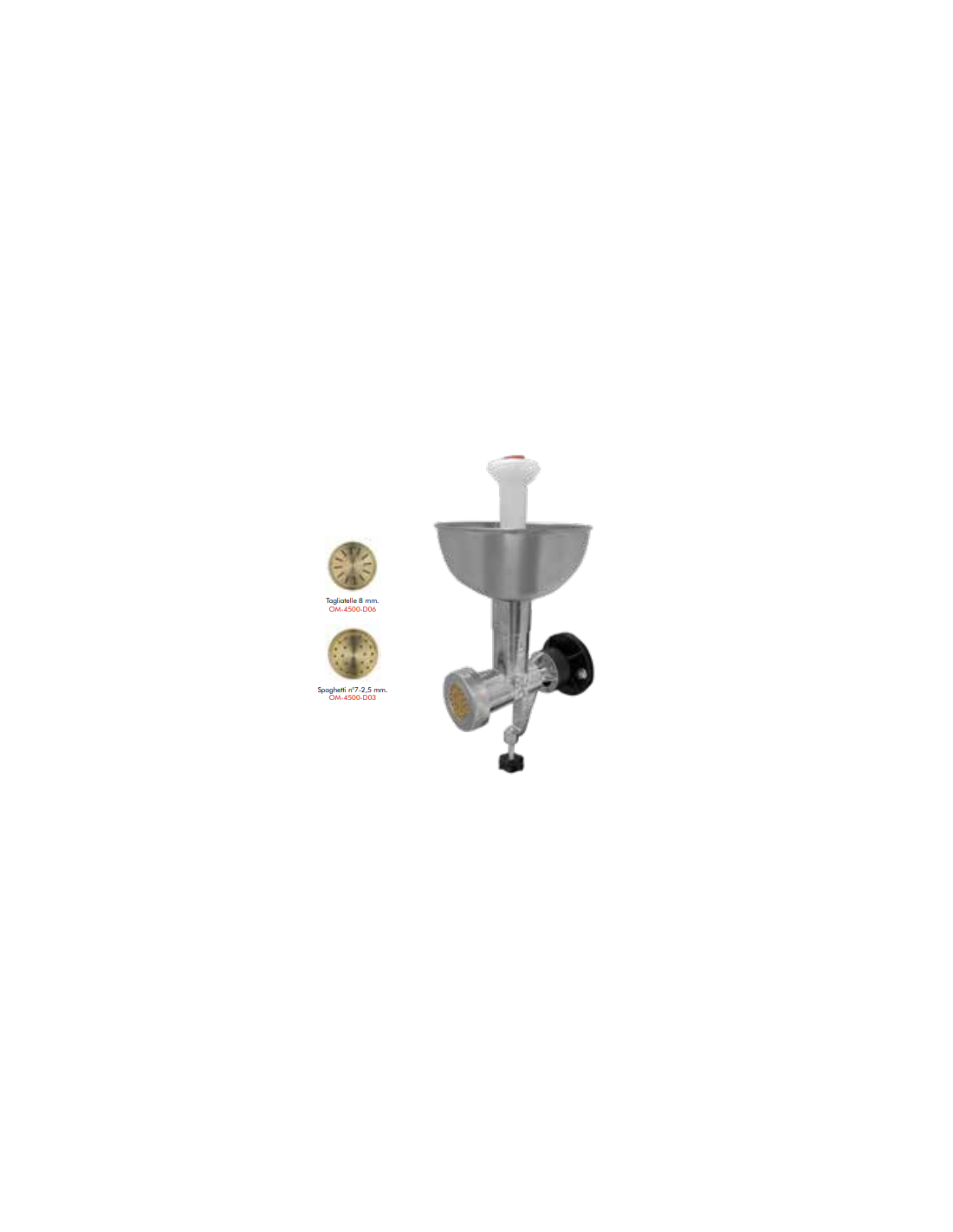 In dotazione 2 trafile in bronzo: spaghetti 2,5 mm, tagliatelle 8 mm. Diametro trafila 45 mm