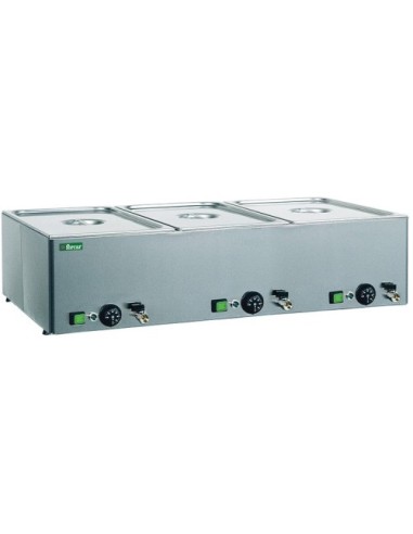 Vasca bagnomaria Forcar con temperature differenziate. Vasca bagnomaria da banco per 3 x GN1/1 - 150(h) mm con rubinetto per scarico acqua.