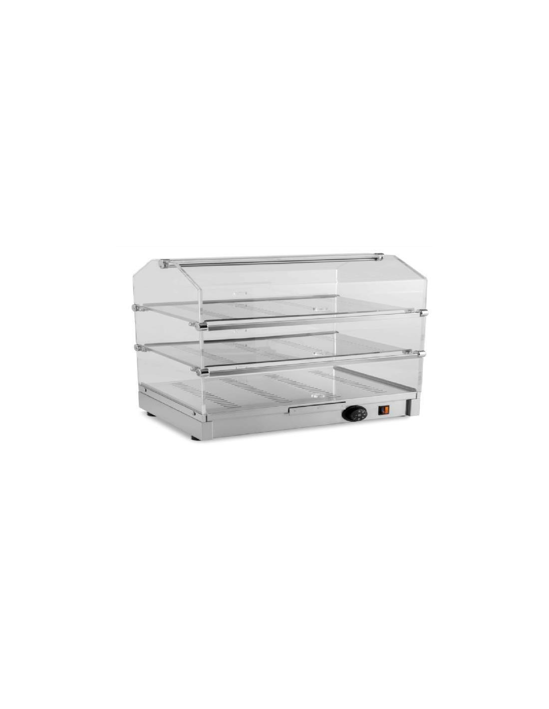 Vetrinetta riscaldata da banco per bar, adatta per dolci da forno, con tre ripiani. Vetrina riscaldata sopra banco e tre antine in plexiglass sagomate