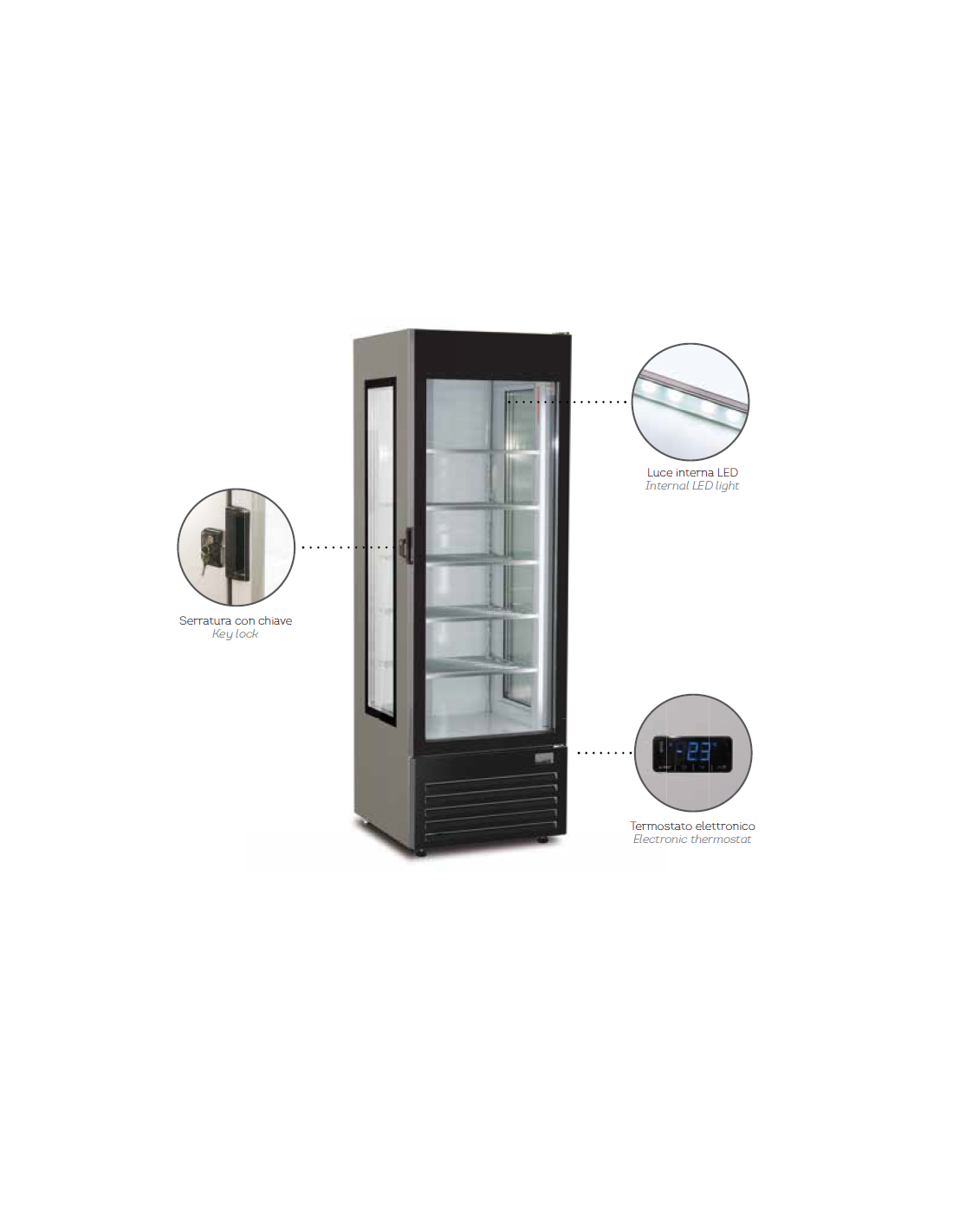Vetrina congelatore Pasticceria e Gelateria per torte e semifreddi. Vetrina verticale con refrigerazione statica con 3 lati espositivi con colore esterno grigio silver