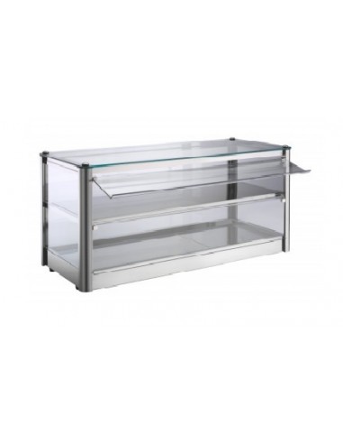 Vetrina neutra da banco per cornetti e paste con 2 ripiani per bar e caffetteria. Il piano superiore è in vetro temperato spessore 5 mm, fissato alla struttura con 4 robuste viti a testa larga