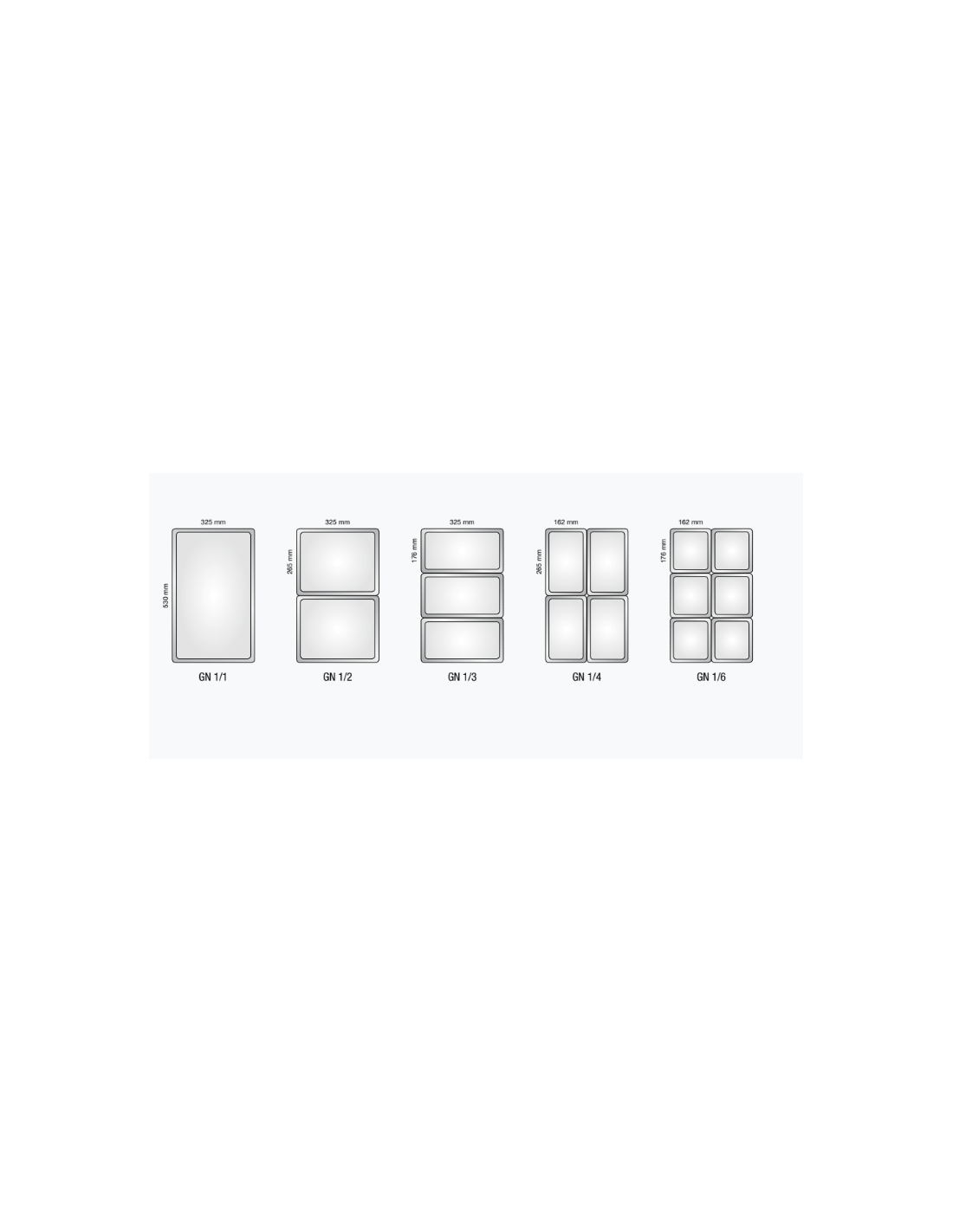Idonea a contenere bacinelle gastronorm inox o in policarbonato con profondità massima di 150mm (bacinelle e coperchi esclusi)